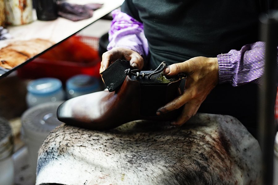 A full-grain leather shoe, if left untreated, will develop a natural patina. However, skilled workers can hand-apply coloring techniques that add layers of shades to full-grain leather, creating a bespoke, aged look.